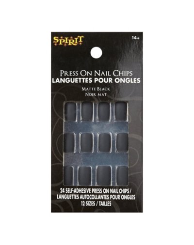 TheMatte Press-on Nails contains 24 different sized press-on nails. Use this set to top off your Gothic vampire or witch costume! Includes: Sheet of 24 black matte press-on nails Note: Do not use on broken, blemished or sensitive skin. See packaging for more information.