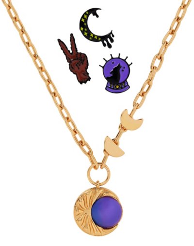 Bring on the bling with this Monster High Clawdeen jewelry set! With its glittery gemstone necklace and three pins, this set is a perfect way to accessorize your Monster High costume or every day look. Officially licensed Includes: 1 Necklace 3 Pins Clasp/Post closure Material: Zinc, plastic Care: Spot clean Imported.