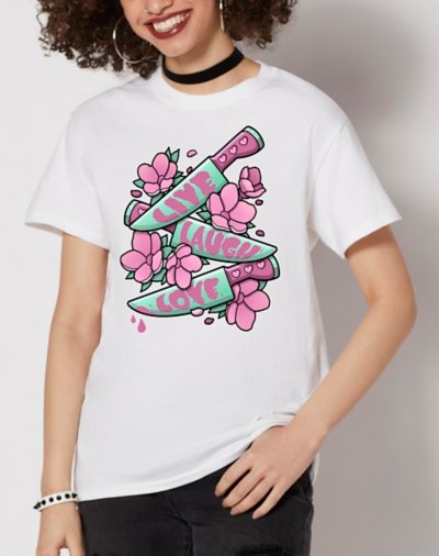 This twisted "live, laugh, love" t shirt by Kawaii Krypt is a little different from the sign hanging in your mom's kitchen. With a colorful combination of flowers and knives, this graphic tee is anything but basic. Crewneck Short sleeves Material: Cotton Care: Machine wash; tumble dry low Imported This shirt is Unisex Sizing only For a fitted look, order one size smaller than your normal size Note: This item is print to order and may have a 1-2 day extra processing time.