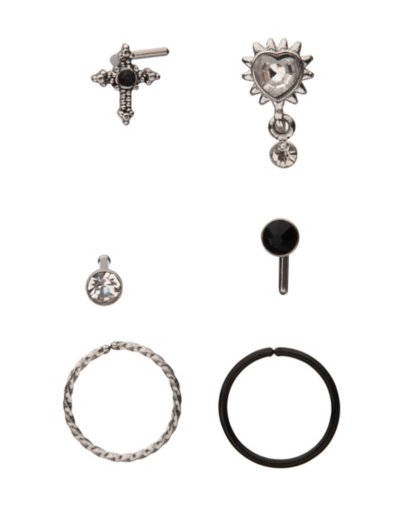 Buy Multi-Pack Black and CZ Cross Heart L-Bend Pin and Hoop Nose Rings 6 P for $19.99 at @ Spencersonline.com