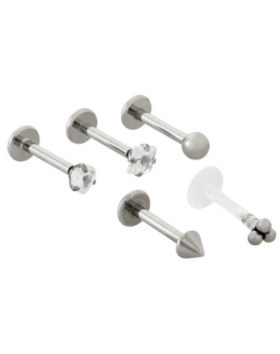 Includes: 5 Labret lip rings Piercing Type: Lip Barbell Material: 316L Surgical steel Accent Material: 316L Surgical steel Gauge: Gauge/1.2mm Barbell Length: 5/16" Stone Type: Cubic zirconia Push in closure Jewelry Care: Clean with antibacterial soap and warm water Piercing Care: Clean withH2Ocean Aftercare Spray(sold separately) or saline solution Imported Note: Do not use any harsh, alcohol-based chemicals as this may cause tarnishing Do not over-thread or apply excess pressure when adding/removing beads as breakage could occur Surgical steel may contain traces amounts of nickel W.