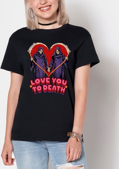 Add a fresh new look to your casual outfit by adding this Love You to Death T Shirt to your casual wardrobe. This awesome tee features the work of Steven Rhodes and is sure to have you looking and feeling your best. Officially licensed Exclusively at Spencers Crewneck Short sleeves Material: Cotton Care: Machine wash; tumble dry low Imported This tee is Unisex Sizing only For a fitted look, order one size smaller than your normal size Note: This item is print to order and may have a 1 to 2 day extra processing time.