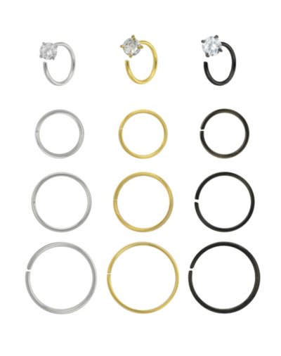 Buy Multi-Pack Round CZ Black and Goldtone Hoop Nose Rings 12 Pack - Ga for $26.99 at @ Spencersonline.com