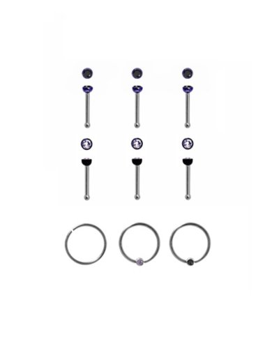 Exclusively at Spencer's Includes: 6 Nose pins 3 Hoop nose rings Piercing Type: Nose Barbell Material: 316L Surgical steel Plating: Ion plated Gauge: Gauge Length: 6mm Stone Type: Cubic zirconia Ball Size: 2mm Jewelry Care: Clean with antibacterial soap and warm water Piercing Care: Clean with H2Ocean Aftercare Spray (sold separately) or saline solution Imported Note: Do not use any harsh, alcohol-based chemicals as this may cause tarnishing Surgical steel may contain trace amounts of nickel.