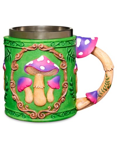 Perk up your morning with this fun mushroom coffee mug! With its groovy design, this colorful mug is the perfect vessel for your favorite beverage. Dimensions: 2.7" H x 4.5" W x 4" D Capacity: oz. Material: Polyresin, stainless Care: Hand wash Imported.