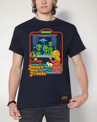Add some out-of-this-world style to your wardrobe when you get this officially licensed Jenny's New Friends T Shirt by Steven Rhodes. This stylish tee features the signature Steven Rhodes logo on the hem and will instantly elevate your look. Officially licensed Exclusively at Spencer's Crewneck Short sleeves Material: Cotton Care: Machine wash; tumble dry low Imported This shirt is Unisex Sizing only For a fitted look, order one size smaller than your normal size Note: This item is print to order and may have a 1 to 2 day extra processing time.