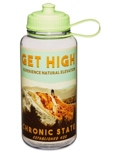 Stay hydrated at any elevation with this "Get High" water bottle! This convenient water bottle has a screwtop lid and is perfect for taking with you wherever you go. Exclusively at Spencer's Dimensions: 7" H x 7" W x 7" D Capacity: oz.