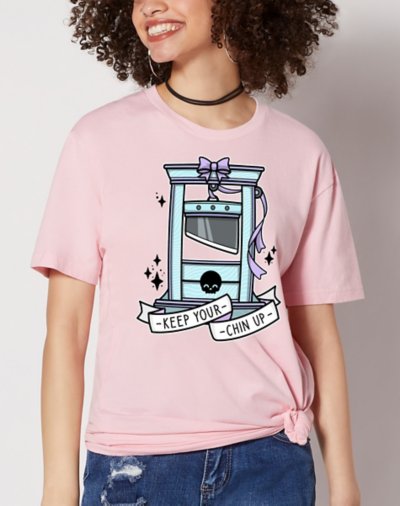 Keep your chin up! The guillotine works better that way. This freakishly funny pink t shirt by Kawaii Krypt will make you laugh your head off. Crewneck Short sleeves Material: Cotton Care: Machine wash; tumble dry low Imported This shirt is Unisex Sizing only For a fitted look, order one size smaller than your normal size Note: This item is print to order and may have a 1-2 day extra processing time.