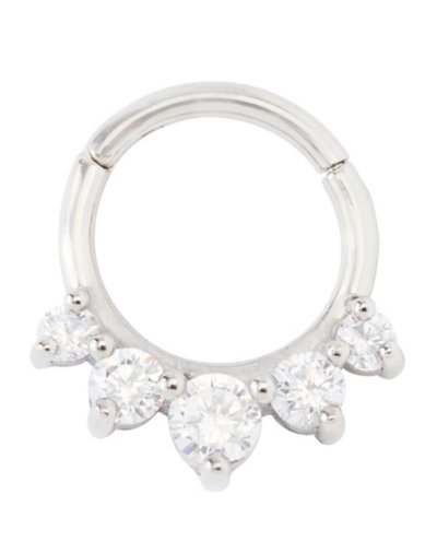 Piercing Type: Nose Barbell Material: 316L surgical steel Accent Material: 316L surgical steel Silver-plated Gauge: Gauge/1.2mm Exterior diameter: 10.4mm Interior diameter: 8mm Stone Type: Clear cubic zirconia Hinged closure Jewelry Care: Clean with antibacterial soap and warm water Piercing Care: Clean withH2Ocean Aftercare Spray(sold separately) or saline solution Imported Note: Do not use any harsh, alcohol-based chemicals as this may cause tarnishing Wear in healed piercings only. If irritation occurs, remove immediately Surgical steel may contain trace amounts of nickel.