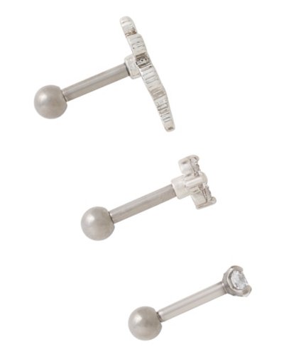 Includes: 3 Cartilage earrings Piercing Type: Cartilage Barbell Material: Titanium, brass Accent Material: Titanium, brass Gauge: Gauge/1.2mm Length: 1/4" Ball Size: 3mm Charm Length: 3mm Externally threaded closure Jewelry Care: Clean with antibacterial soap and warm water Piercing Care: Clean with H2Ocean Aftercare Spray (sold separately) or saline solution Imported Note: Do not use any harsh, alcohol-based chemicals as this may cause tarnishing Wear in healed piercings only. If irritation occurs, remove immediately.