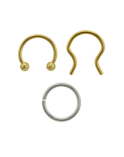 Includes: 2 horseshoe rings 1 hoop ring Piercing Type: Nose Barbell Material: ASTM F-136 Titanium Accent Material: ASTM F-136 Titanium PVD plating Gauge: Gauge/1.2mm Jewelry Care:Clean with antibacterial soap and warm water Piercing Care: Clean with H2Ocean Aftercare Spray (sold separately) or saline solution Imported Note: Do not use any harsh, alcohol-based chemicals as this may cause tarnishing.