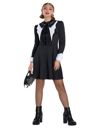 Rock this adorable Black Gothic Dress this Halloween! This all-black beauty features intricate white lace detailing on the collar and sleeves. Material: Polyester Care: Spot clean Pullover style Snap closure Imported Note: Shoes, bag, and stockings sold separately.