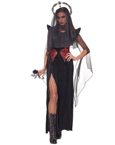 From Our Exclusive Signature Collection. Feeling sinister? Become the leader of the dark side and show off your incredible style when you wear this Dark Priestess Costume. Featuring a beautiful black dress with red accents, a bolero, a necklace, a veil, and a crown, this haunting outfit is sure to stand out at your Halloween celebration. Exclusively at Spirit Halloween Includes: Dress Bolero Necklace Veil Crown Crewneck Short sleeves Pull-on style Material: Polyester Care: Spot clean Imported Note: Shoes and accessory sold separately.