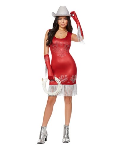 Want to dress up as a glamorous cowgirl this Halloween? We've got exactly what you need. This ravishing red cowgirl dress has fringe detailing at the bottom and will serve as the perfect finishing touch to your western style. Includes: Dress Gloves Sleeveless Pullover style Material: Polyester, spandex Care: Spot clean Imported Note: Hat, shoes, necklace, and lasso sold separately.