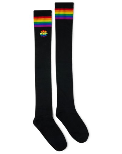 Make a fashion statement by adding these colorful socks to any outfit. These over the knee socks feature rainbow stripes and a rainbow flower and are the perfect accessory to help you stand out! Material: Polyester, spandex Care: Machine wash Imported.