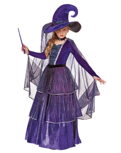 From our exclusive Signature Collection. Your child will be casting spells and mixing potions all Halloween long in this awesome witch costume! Featuring a glimmering dress with a tiered skirt, a witch hat and a choker necklace, your child will be the definition of mystical. Bring along the magic wand to complete the look! Includes: Dress Hat Choker Wand V-neck Long sleeves Pull down style Material: Polyester Care: Spot clean Imported.