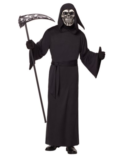 Terrorize the entire neighborhood when you put on this haunting skeleton costume. It features arobe, a belt, a pair of gloves, and a half mask that's absolutely spine-chilling. Become the undead! Includes: Half mask Hooded robe Belt Gloves Long sleeves Pullover style Material: Polyester, polyvinylchloride, spandex Care: Hand wash Imported Note: Shoes sold separately.