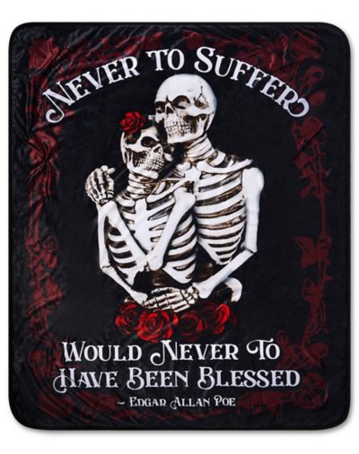 Add a romantically gothic touch to your living space with this exclusive Never to Suffer Fleece Blanket. Inscribed with an iconic verse by literary legend Edgar Allan Poe, this cozy, charming fleece is simply to die for. Exclusively at Spencer's Dimensions: 60" H x 50" W Material: Polyester Care: Machine wash cold with like colors Imported.