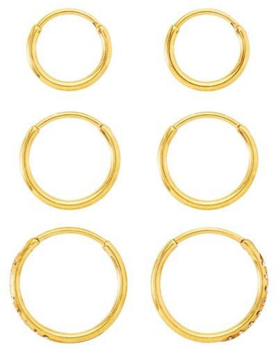 Includes: 3 Pairs of hoop earrings Exterior diameter: 10.4mm/12.4mm/14.4mm Interior diameter: 8mm/10mm/12mm Material: 316L Surgical steel Clip closure Jewelry Care: Wipe clean or Spencer's Jewelry Wipes Imported Note: Do not use any harsh, alcohol-based chemicals as this may cause tarnishing Surgical steel may contain trace amounts of nickel This is a decorative item and should not be worn to sleep.