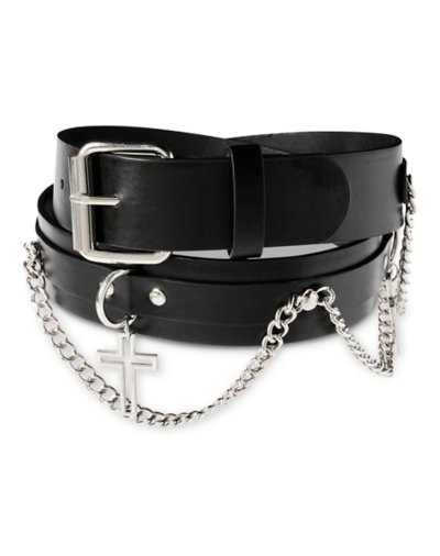 Complete your next casual gothic look with this Hanging Cross Chain Belt. This belt's hanging silver chains and crucifix charms are the perfect blend of elegance and edginess. Exclusively at Spencer's Adjustable Material: Polyurethane Care: Spot clean Buckle closure Imported.