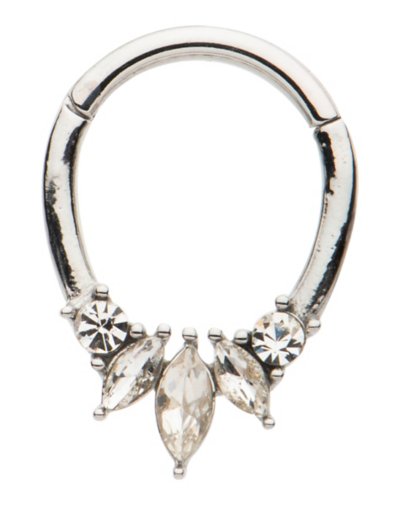 Includes: 1 Septum hinged hoop Piercing Type: Septum Barbell Material: 316L surgical steel Gauge: gauge/1.2mm Interior Diameter: 7mm Exterior Diameter: 8mm Stone Type: Cubic zirconia Hinged closure Jewelry Care: Clean with antibacterial soap and warm water Piercing Care: Clean withH2Ocean Aftercare Spray(sold separately) or saline solution Imported Note: Do not use any harsh, alcohol-based chemicals as this may cause tarnishing Surgical steel may contain trace amounts of nickel Do not over-thread or apply excess pressure when adding/removing beads as breakage could occur.