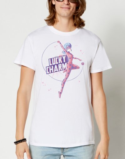 Add a fun element to your casual wardrobe with this Miraculous Ladybug Lucky Charm t shirt! This white graphic tee of the show's superpower is sure to be a super hit whenever you wear it. Exclusively at Spencer's Officially licensed Crewneck Short sleeves Tagless Material: Cotton Care: Machine wash; tumble dry low Imported This shirt is Unisex Sizing only For a fitted look, order one size smaller than your normal size.
