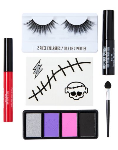 Look just like your favorite Monster High character, Frankie Stein, when you use this makeup kit! This kit has everything you need to transform your face into Frankie's and have a monstrously good time. Officially licensed Includes: 4 eyeshadows Matte lip cream Liquid eyeliner 1 set of false eyelashes Eyelash glue 3 decals Applicator Ingredients: Eyeshadow: Mica, kaolin, ethylhexyl palmitate, magnesium stearate, ozokerite, phenoxyehtanol. May contain: Red 40 Lake, iron oxides, Blue 1 Lake. Matte lip cream: Isododecane, polybutene, kaolin, ethylhexyl palmitate, caprylic/capric triglyceride, paraffin, phenoxyethanol, benzyl alcohol, ethylhexylglycerin, Red 7 Lake, Blue 1 Lake, Yellow 5 Lake, iron oxides, titanium dioxide. Liquid eyeliner: Water, glyceryl, stearate, acrylat.
