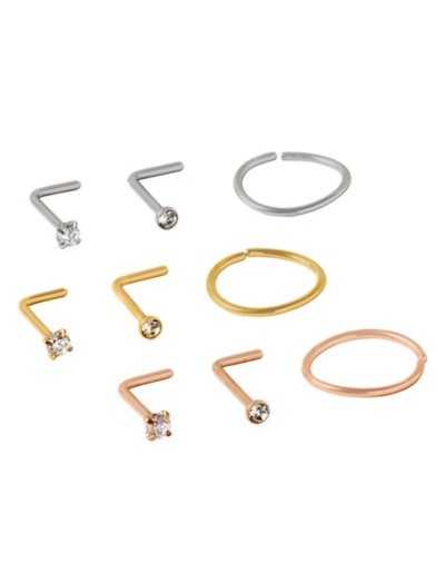 Buy Multi-Pack CZ Rose Gold Silver and Gold L-Bend and Hoop Nose Rings 9 P for $24.99 at @ Spencersonline.com