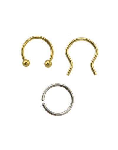 Includes: 1 Horseshoe 1 Septum Retainer 1 Seamless Hoop Piercing Type: Multiple Material: 316L surgical steel Gauge: Gauge/1.3mm Length: 10mm Ball Size: 3mm Jewelry Care: Clean with antibacterial soap and warm water Piercing Care: Clean withH2Ocean Aftercare Spray(sold separately) or saline solution Imported Note: Do not use any harsh, alcohol-based chemicals as this may cause tarnishing Wear in healed piercings only. If irritation occurs, remove immediately.