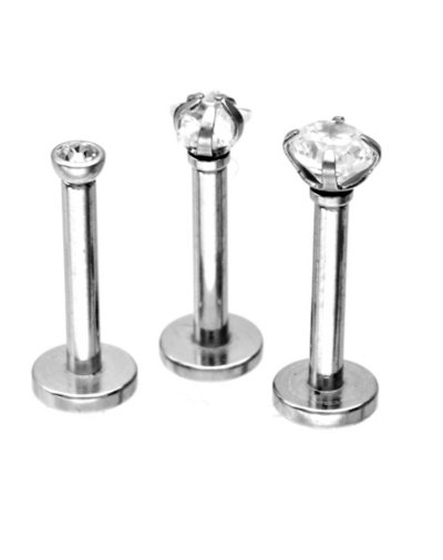 Gauge Clear Cubic Zirconia Labret 3-Pk includes three unique diamond designs with thread closure Includes: 3 Lip Rings Piercing Type: Labret Material: 316L Surgical steel Accent Material: Metal alloy Barbell Size: Gauge Barbell Thickness: 1.3mm Stone type: Cubic zirconia Threading Type: External Threaded closure Jewelry Care: Clean with antibacterial soap and warm water Piercing Care:Clean with H2Ocean Aftercare Spray (sold separately) or saline solution Imported Note: Do not use rubbing alcohol to clean jewelry. Normal alcohol consumption and/or mouthwash may accelerate wear and tear Do not over-thread or apply excess pressure when adding/removing beads as breakage could occur Surgical steel may contain.