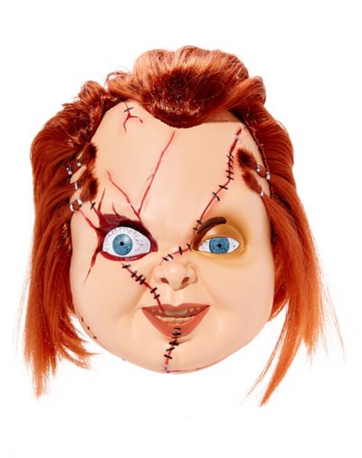 You'll be a walking Chucky doll in this full mask! This kids' Chucky mask features fiery red hair and bone-chilling facial scars. An elastic band keeps this scary mask secure while you're up to no good. Officially licensed Dimensions: Width: about 10 Height: About 10 Depth: About 5 Elastic closure Material: Plastic, synthetic fibers Care: Spot clean Imported.