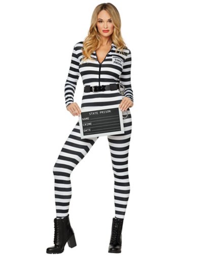 Everyone will think you got arrested for looking so good when you wear this jailbird catsuit costume. This skintight costume will accentuate your natural curves and leave you feeling sexy and comfortable all night long! Add the included belt and advertise your crime on the included chalkboard for a complete look! Includes: Catsuit Belt Handcuffs Mugshot chalkboard Chalk Long sleeves Front zipper closure Inseam: About 29" Material: Polyester, spandex Care: Spot clean Imported Note: Shoes sold separately.