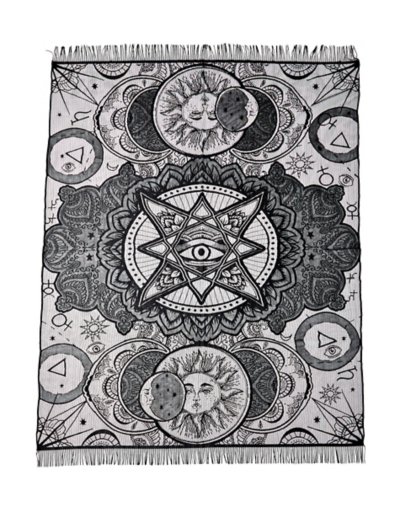 Looking for an out-of-this-world tablecloth? This pieces complex cosmic design is sure to catch the eye. Adorned with suns, moons, eyes, and more, this celestial setting really has it all. Exclusively at Spirit Halloween Dimensions: 84 H x 60 W Material: Polyester Care: Machine wash cold Imported Note: Recommended for use in covered areas.