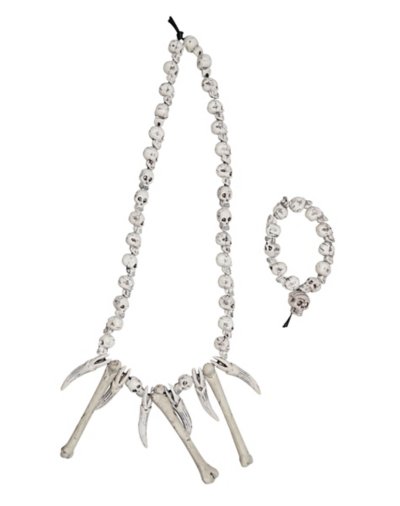 Add a haunting look to almost any costume when you accessorize with this skeletal jewelry! Both the necklace and bracelet feature small skull beads, and the necklace also has different bone charms hanging off it, making this the perfect accessory set for almost any dark costume. Includes: Necklace Bracelet Material: Plastic Care: Spot clean Imported.