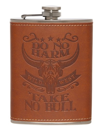 Complete your wild west look and prepare for the night of your life with this No Bull Western Flask. Use this as an accessory on Halloween night and get the party started! Material: Iron Care: Hand wash Imported.