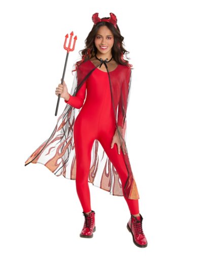 Complete any dark and mysterious devil-inspired look in no time when you wear this Devil Flame Cape. With this stylish cape added to your look this Halloween youll be ready to get into all types of devious activity. Includes: Cape Velcro closure Material: Polyester Care: Spot clean Imported Note: Jumpsuit, shoes, headband, and prop sold separately.