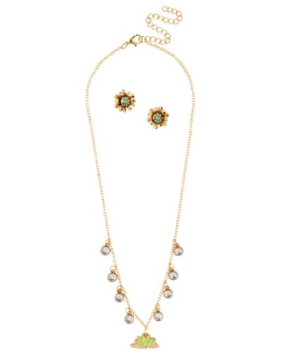 Shine as bright as your favorite Disney princess when you get this Tiana Jewelry Set! With the included necklace and pair of earrings, you can show love for The Princess and the Frog all Halloween long. Officially licensed Includes: Necklace Pair of earrings Material: Iron, metal alloy, polyester, acrylic, rubber Lobster claw closure Care: Wipe clean Imported.