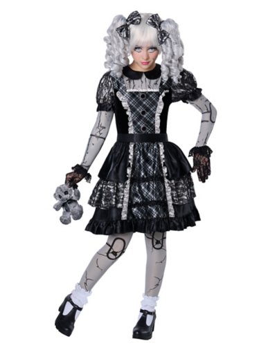 From our exclusive Signature Collection. Going for a creepy look this Halloween? We've got the perfect costume for you. The Broken Doll costume includes a dress, tights, gloves, bows and a teddy bear, making you look like an evil doll that came to life! Includes: Dress Tights Gloves Bows Teddy bear Crewneck Long sleeves Pullover style Material: Polyester, spandex Care: Spot clean Imported.