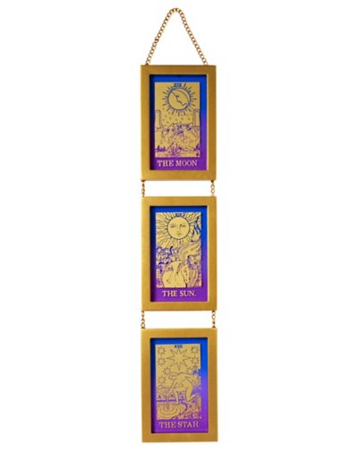 Looking for some cosmically-inspired style to add to your home? This Tarot 3-Tier Hanging Sign might just be in the cards for you. This eye-catching sign features bright, goldtone detailing of three of the Major Arcana that tarot readers will recognize from their deck: the Moon, the Sun, and the Star! Dimensions: 21.65" H x 0.4" W x 4" D Material: MDF, glass Care: Spot clean Imported.
