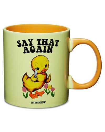 Everyone will know you're on your last straw when you use this Say That Again Coffee Mug. Featuring an adorably threatening duck on the fron this mug is sure to look great in any drinwkare collection. Officially licensed Exclusively at Spencer's Dimensions: 4.3" H x 4" W x 4" D Capacity: oz. Material: New bone china Microwave safe Care: Dishwasher safe Imported.