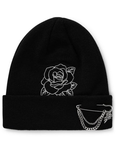 Stand out in this stylish knit hat with an embroidered rose and safety pin chain. It's the perfect bold topper to any outfit! Material: Acrylic Care: Machine wash Imported One size fits most.