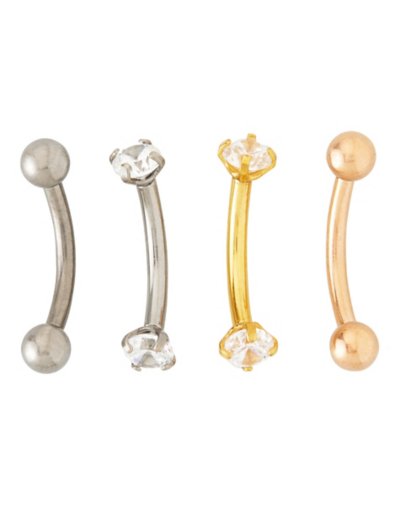 Includes: 4 Curved barbells Piercing Type: Eyebrow Barbell Material: Titanium Gauge: gauge/1.2mm Barbell Length: 8mm Stone Type: Cubic zirconia Externally threaded closure Jewelry Care: Clean with antibacterial soap and warm water Piercing Care: Clean with H2Ocean Aftercare Spray (sold separately) or saline solution Imported Note: Do not use any harsh, alcohol-based chemicals as this may cause tarnishing Do not over-thread or apply excess pressure when adding/removing beads as breakage could occur Wear in healed piercings only. If irritation occurs, remove immediately This is a decorative item and should not be worn to sleep.