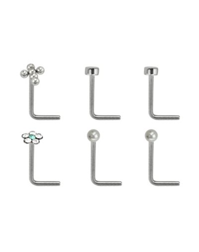 Includes: 6 L-Bend nose rings Piercing type: Nose Material: 316L Surgical steel Available in multiple sizes Length: 5/16" (8mm) Stone type: Cubic zirconia Jewelry Care: Clean with antibacterial soap and warm water Piercing Care: Clean with H2Ocean Aftercare Spray (sold separately) or saline solution Imported Note: Do not use any harsh, alcohol-based chemicals as this may cause tarnishing Surgical steel may contain trace amounts of nickel.