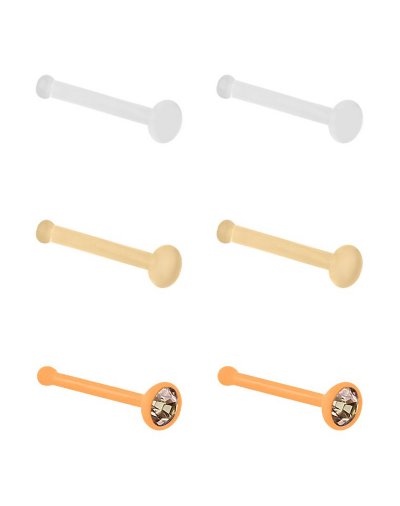 Exclusively at Spencer's Includes: 6 Nose pins Piercing Type: Nostril Material: Bioflex Gauge: gauge/0.8mm Length: 6.5mm Stone Type: Cubic zirconia Ball Size: 2mm Jewelry Care: Clean with antibacterial soap and warm water Piercing Care: Clean withH2Ocean Aftercare Spray(sold separately) or saline solution Imported Note: Do not use any harsh, alcohol-based chemicals as this may cause tarnishing Wear in healed piercings only. If irritation occurs, remove immediately This is a decorative item and should not be worn to sleep.