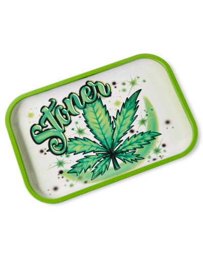 Looking to add a groovy element to your home decor? This weed leaf stoner tray features an airbrush design and will instantly boost the vibes in your favorite room. Exclusively at Spencer's Dimensions: 11" L x 7" W Material: Tin Care: Spot clean Imported.