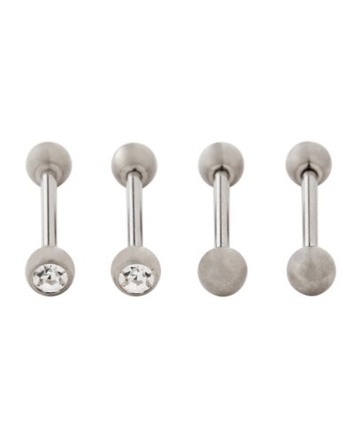 Includes: 4 barbells Piercing Type: Multiple Barbell Material: G23 Titanium Accent Material: G23 Titanium Gauge:14 Gauge/1.6mm Ball Size: 3mm Stone Type: Cubic zirconia Externally threaded Jewelry Care:Clean with antibacterial soap and warm water Piercing Care: Clean with saline solution Imported Note: Do not use rubbing alcohol to clean jewelry. Normal alcohol consumption and/or mouthwash may accelerate wear and tear. Do not over-thread or apply excess pressure when adding/removing beads as breakage could occur.