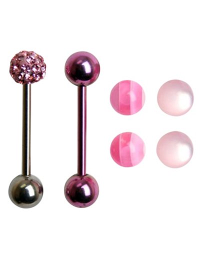 This pink stripe bling barbell set (with four extra balls) includes two piercings and is available in 14G; 7/16". Includes: 2 barbells with 4 interchangeable beads Materials: 316L Surgical Steel Barbell Size: gauge Barbell Thickness: 1.6 mm Barbell Length: 7/16" Threaded closure Jewelry Care: Clean with antibacterial soap and warm water Piercing Care: Clean with saline solution Imported Note: Do not use any harsh, alcohol-based chemicals as this may cause tarnishing Do not over-thread or apply excess pressure when adding/removing beads as breakage could occur Surgical steel may contain trace amounts of nickel.