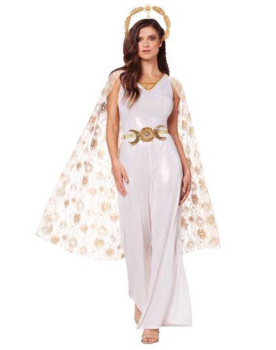 It's time for your moment in the sun! This sun goddess costume features a sleeveless white jumpsuit with a V-neck trimmed in gold fabric. A long, sheer cape adorned with ornate gold accents trails behind you as you follow the sun. A celestial sun and moon belt cinches the waist of this wide-leg jumpsuit, creating a universally flattering silhouette. Top off the look with a sparkling sun headband. You look radiant! Includes: Jumpsuit Cape Belt Headband Sleeveless Material: Polyester, spandex Care: Spot clean Imported.