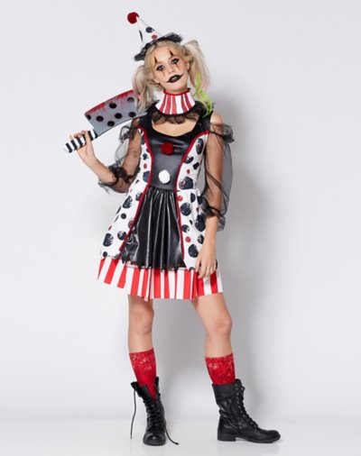 Not all clowns are sweet and innocent, especially not this one! This Twisted Clown costume features a black and white dress with red accents, giving it a dark and sinister look that everyone is sure to scream at. Pair this with scary clown makeup (sold separately) and you're sure to become the scariest thing on the block. Includes: Hat Dress Collar Pettiskirt Socks Zipper closure Material: Polyester Care: Spot clean only Imported Note: Shoes and balloons not included.