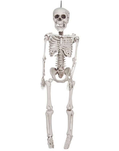 Make no bones about it, this 20-inch posable plastic skeleton is a cool Halloween decor addition. Hang it indoors and scare up some Halloween fun. Dimensions: 20" H x 14" W x 2" D Material: Plastic, metal Realistic bone finish Care: Spot clean Imported Recommended for use in covered areas Note: Color may slightly vary.